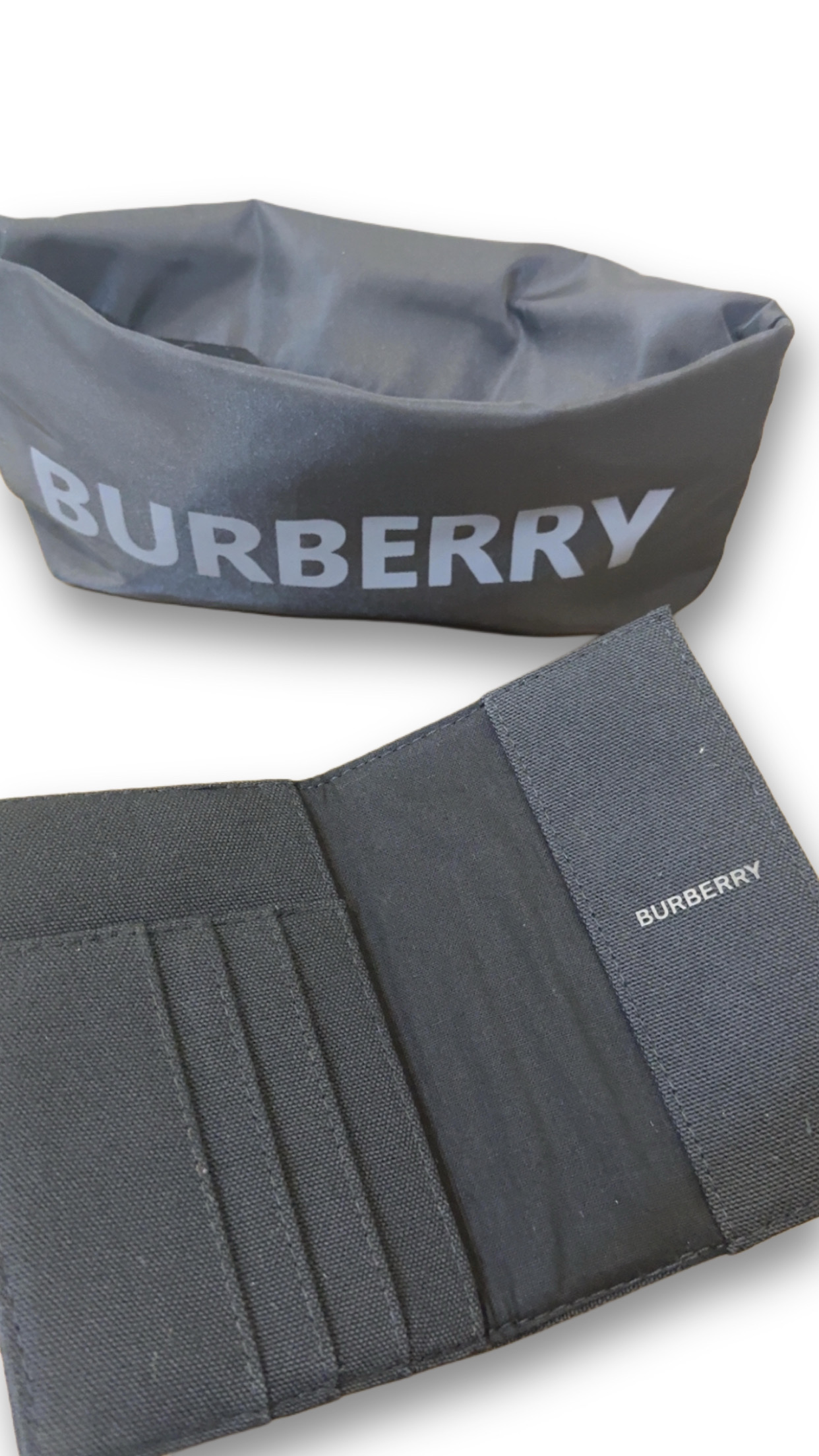 حامل جواز سفر Burberry بحجم تقريبي 14 × 10 سم عند الإغلاق، مع أماكن للبطاقات والوثائق.